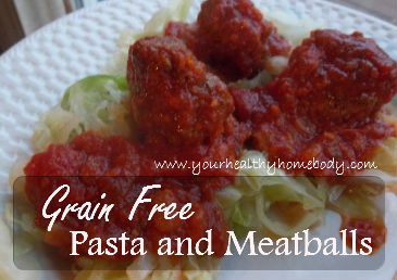 You can make “noodles” out of many different vegetables, including spaghetti squash, zucchini and cabbage. I’ve tried all of the above; the last one we experimented with was the cabbage, and it was a huge success at my house. My little guy asked for seconds and thirds of the “green noodles”, and my husband raved about the meatballs (and he still eats gluten, folks, so they must be OK!)