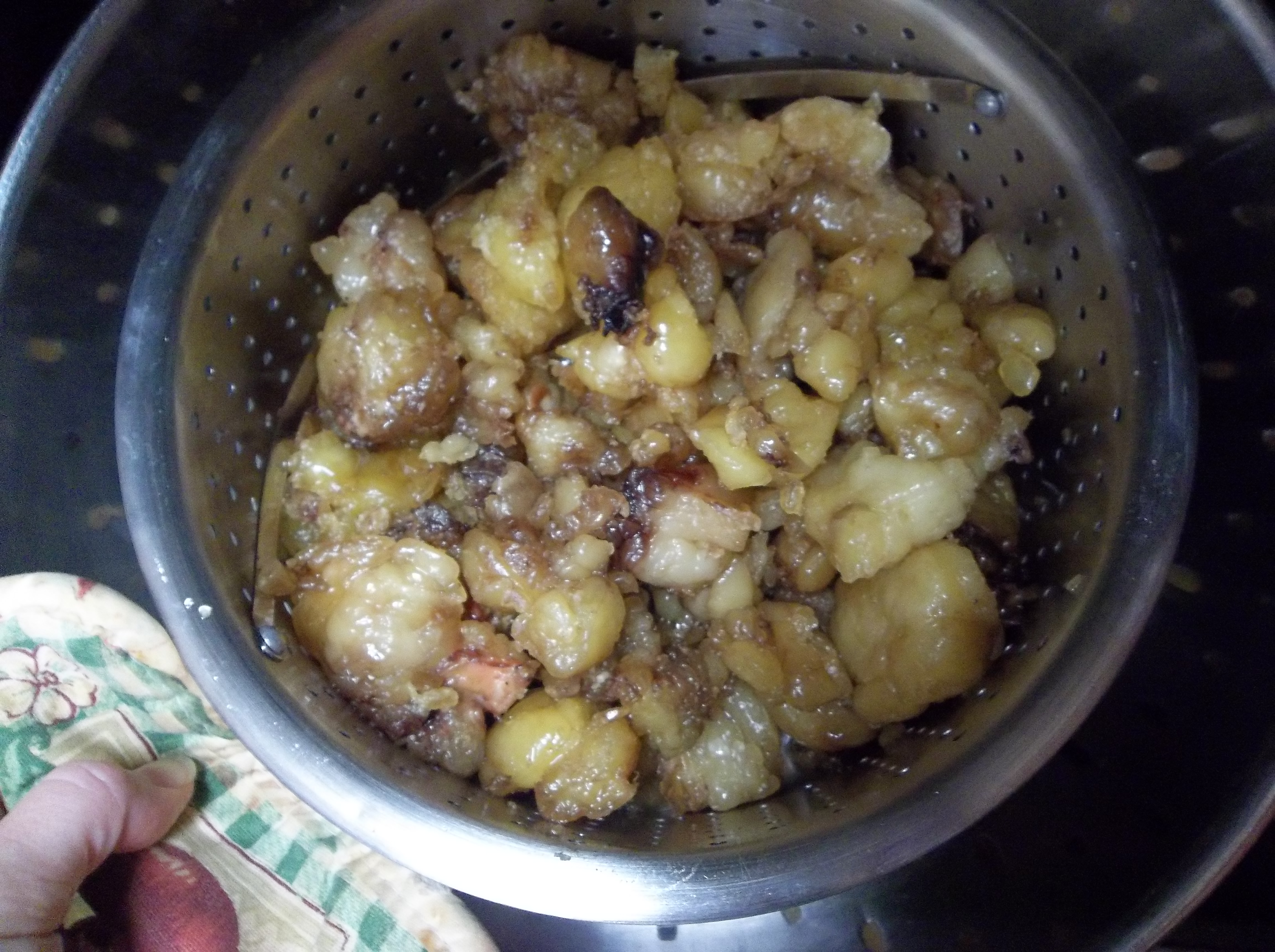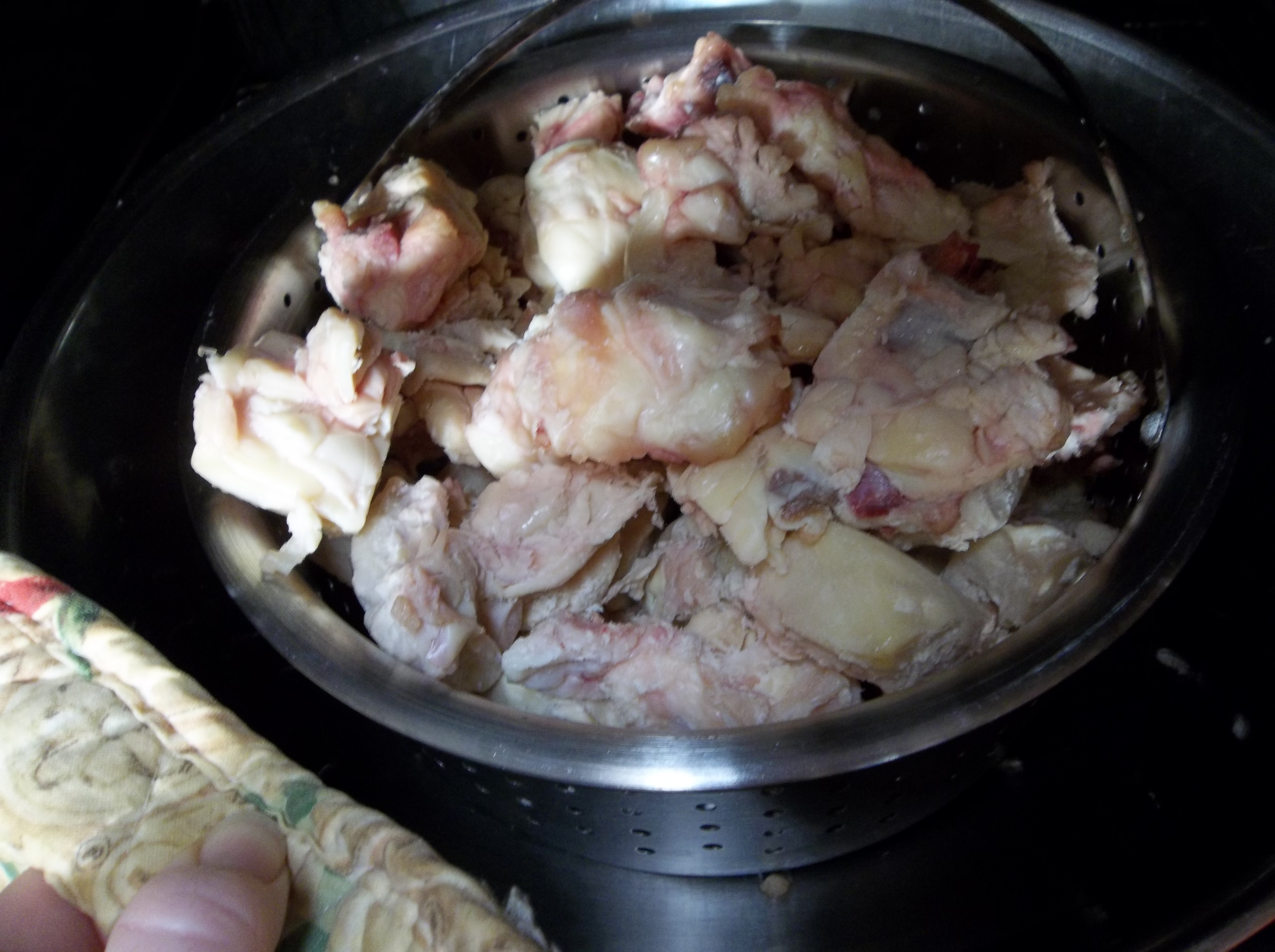 - Place in a colander inside of a large oven-safe pot. (You want the suet IN the colander, with the pot around it to collect the liquid tallow that will drip out).