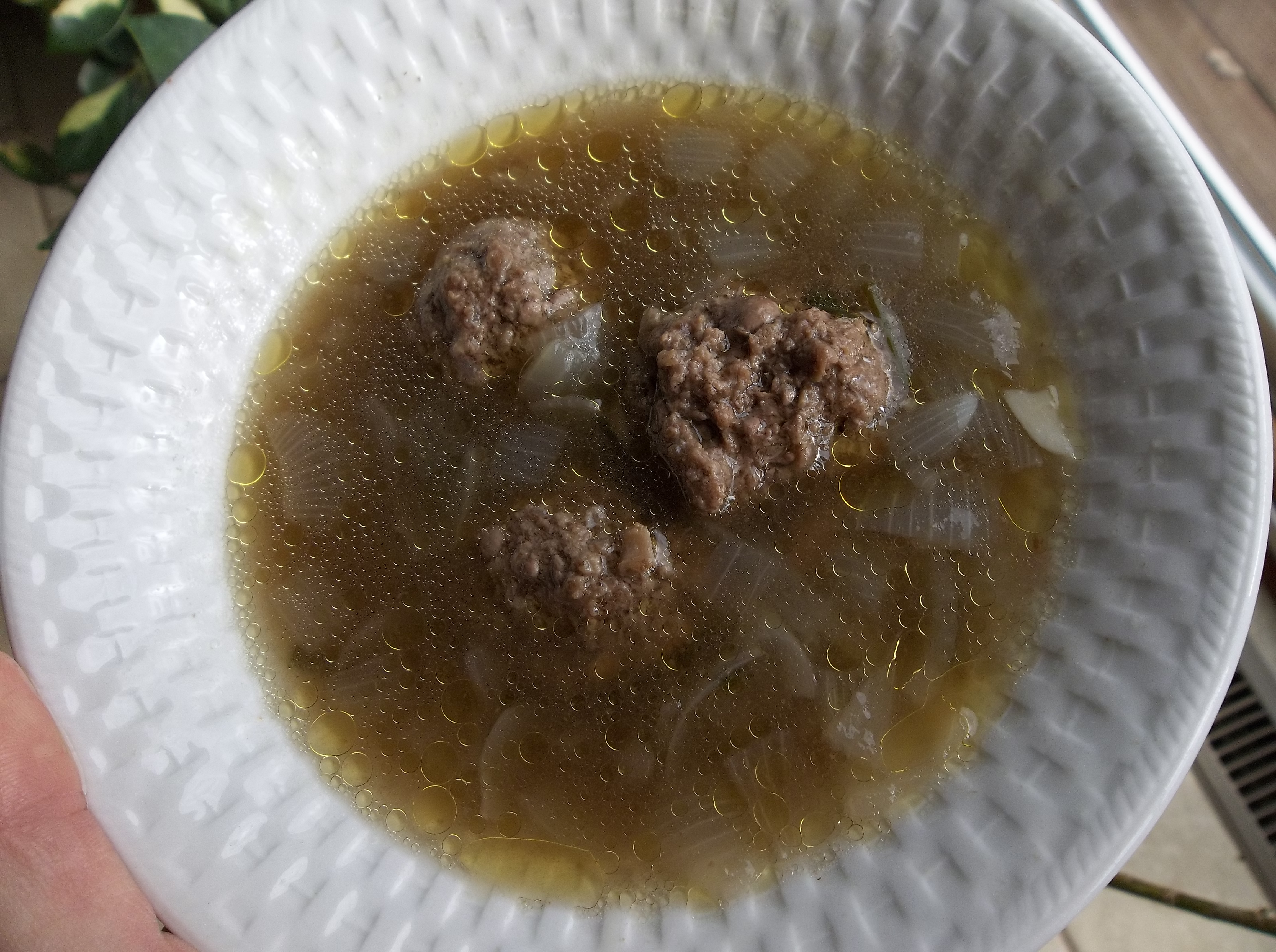 1. Bring your meat stock to a boil and then add your vegetables. As they are simmering, form your meatballs and drop them into the broth. Simmer for about 20-30 minutes until meatballs are cooked through and vegetables are soft.