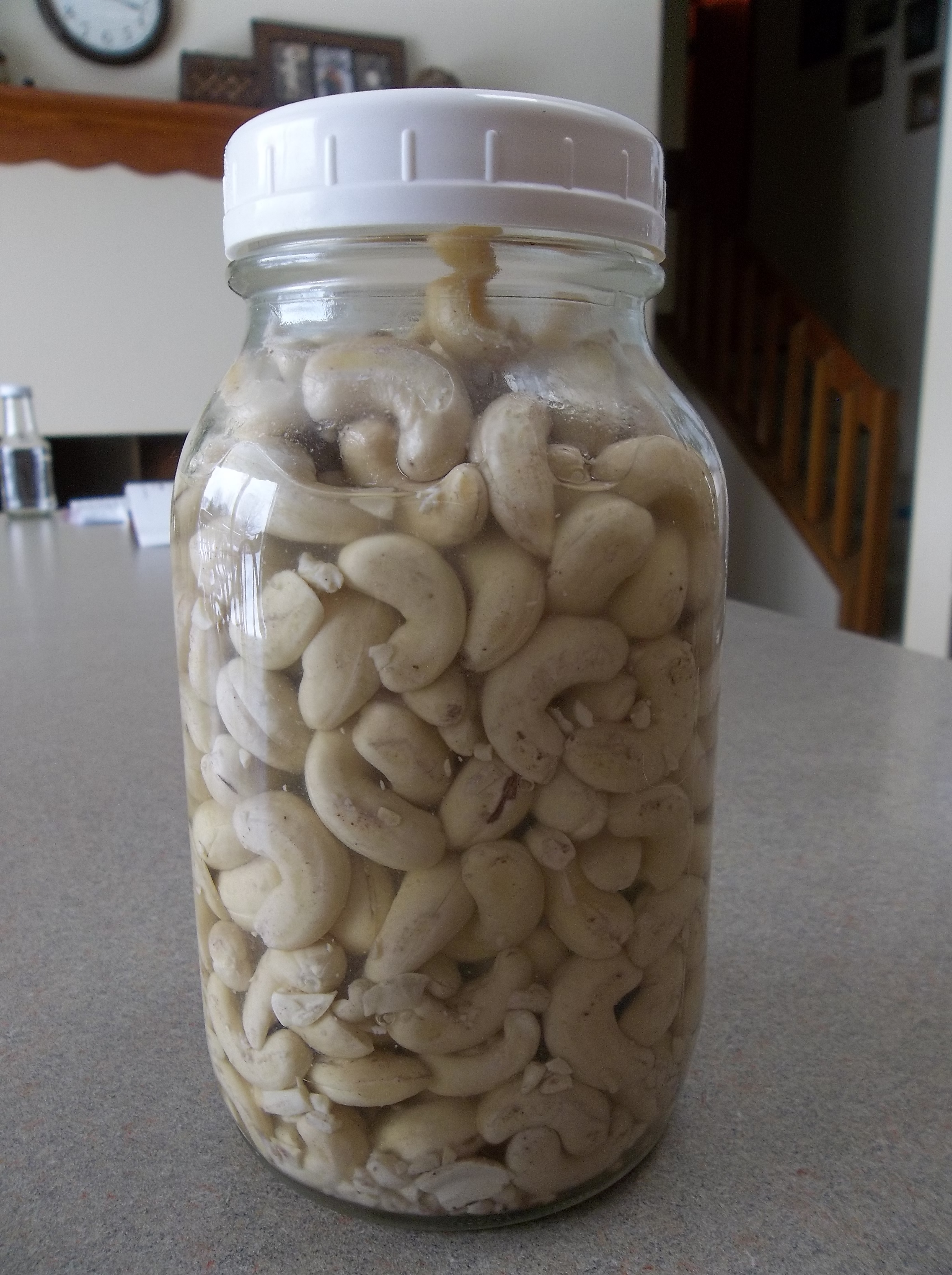 When I’m ready to soak them, I pour the nuts into a quart-sized glass jar, leaving an inch or two of head room as the nuts will expand when soaking.
