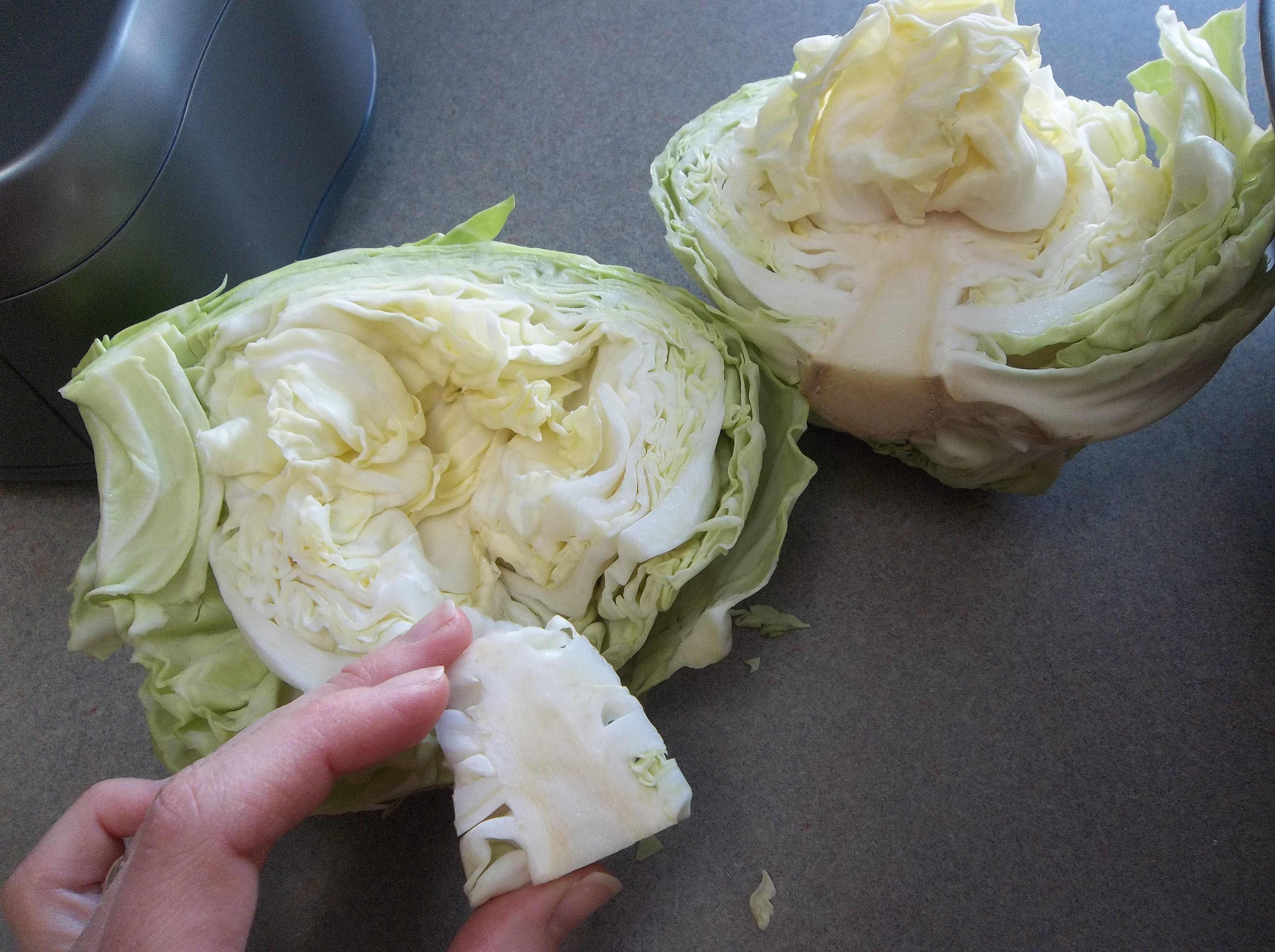 To core my cabbage, I cut it in half, then cut out the core in a triangle shape. There’s many different ways to do this, but I’ve found this to be easiest for me.