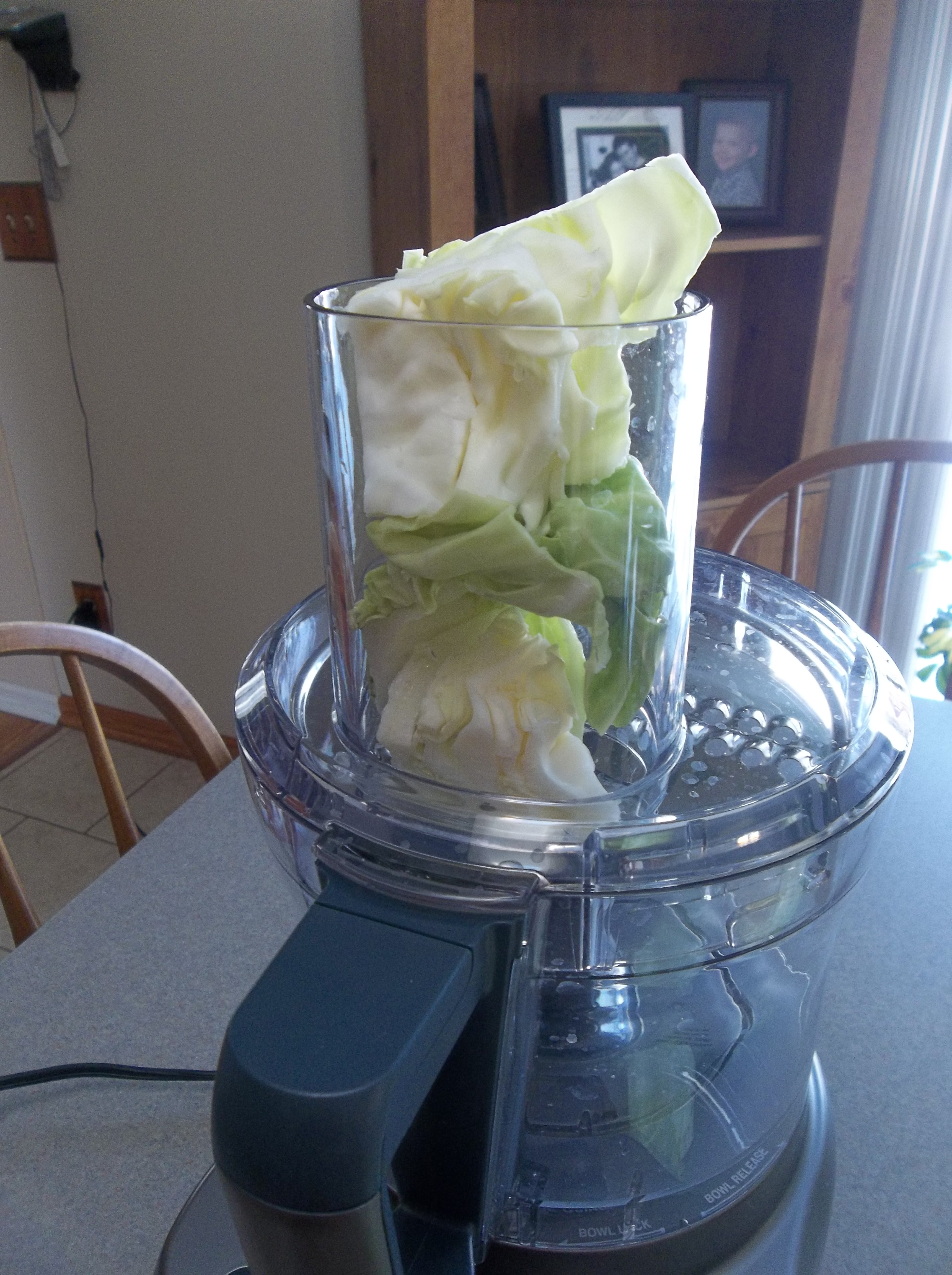 Next, I shred the cabbage in my food processor. You can experiment with different sized shreds. This time, I did the “small shred” in the processor. You can do a bigger shred, or even slice the cabbage into long strips. Each way you do it results in a different tasting sauerkraut; our family likes the finely shredded cabbage, but if you like things a little crispier, you could also just slice your cabbage.