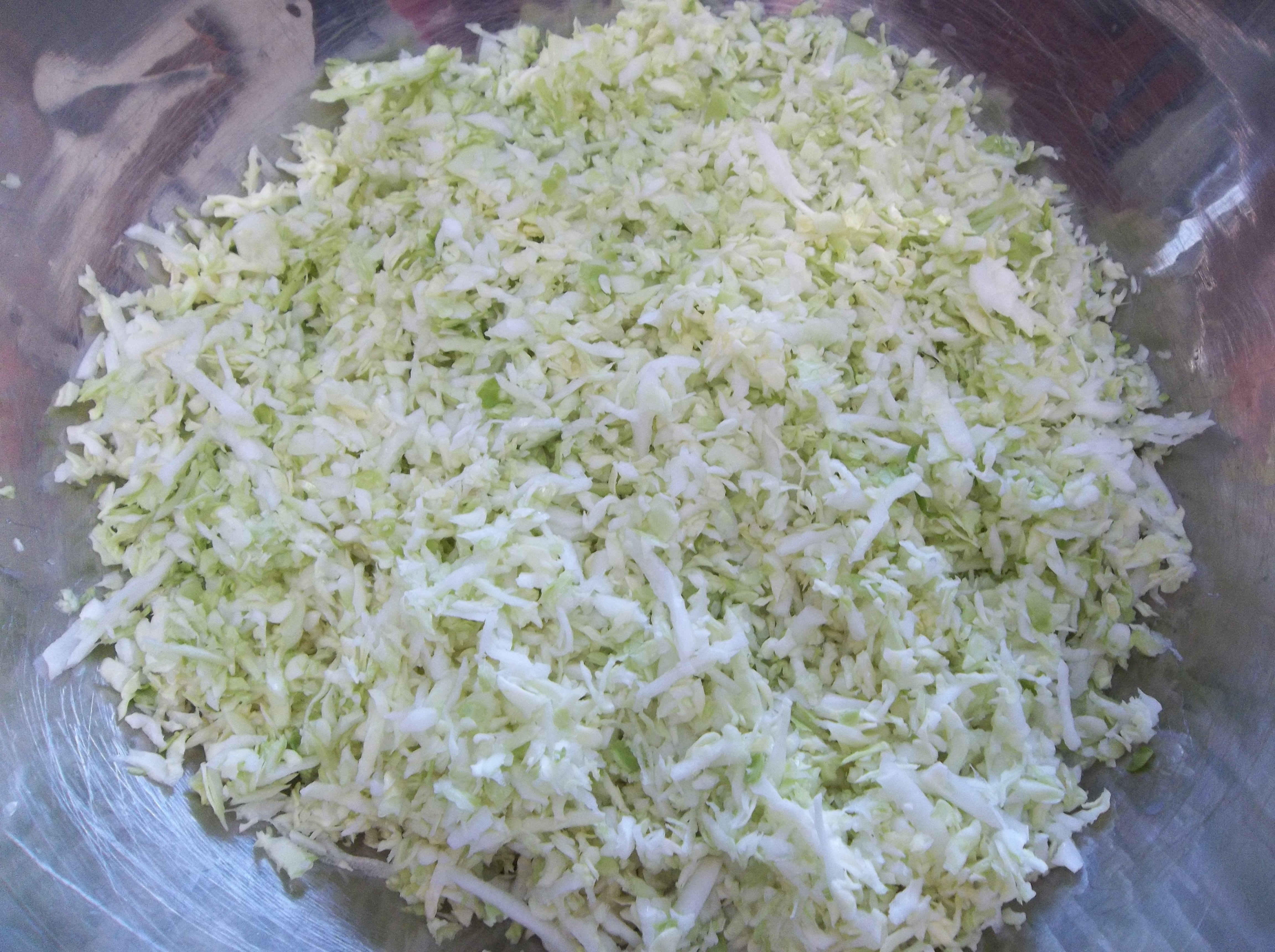 After the cabbage is shredded, I pour it all into a large bowl. I sprinkle 1 Tbs. of sea salt over it, mix it in it loosely with my hands and let it sit for about 10 minutes. This allows the salt to start to work on the cabbage, getting it ready to release its juices.