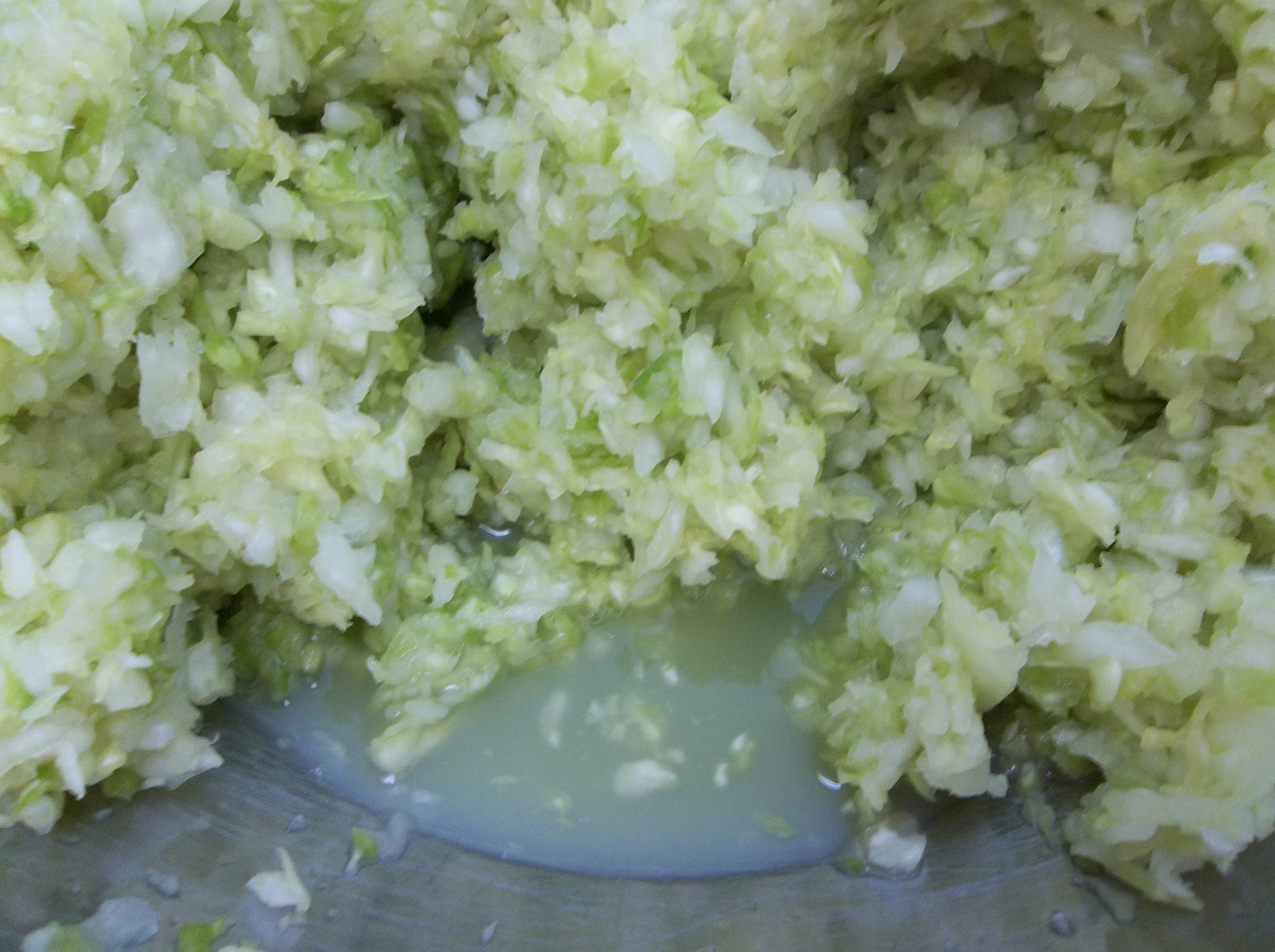 After the 10 minutes are up, I begin to massage the cabbage with my hands. It is kind of like kneading, but also I’m squeezing the cabbage in my hands. This helps release the juices that will form the brine that the kraut will sit in while it ferments.