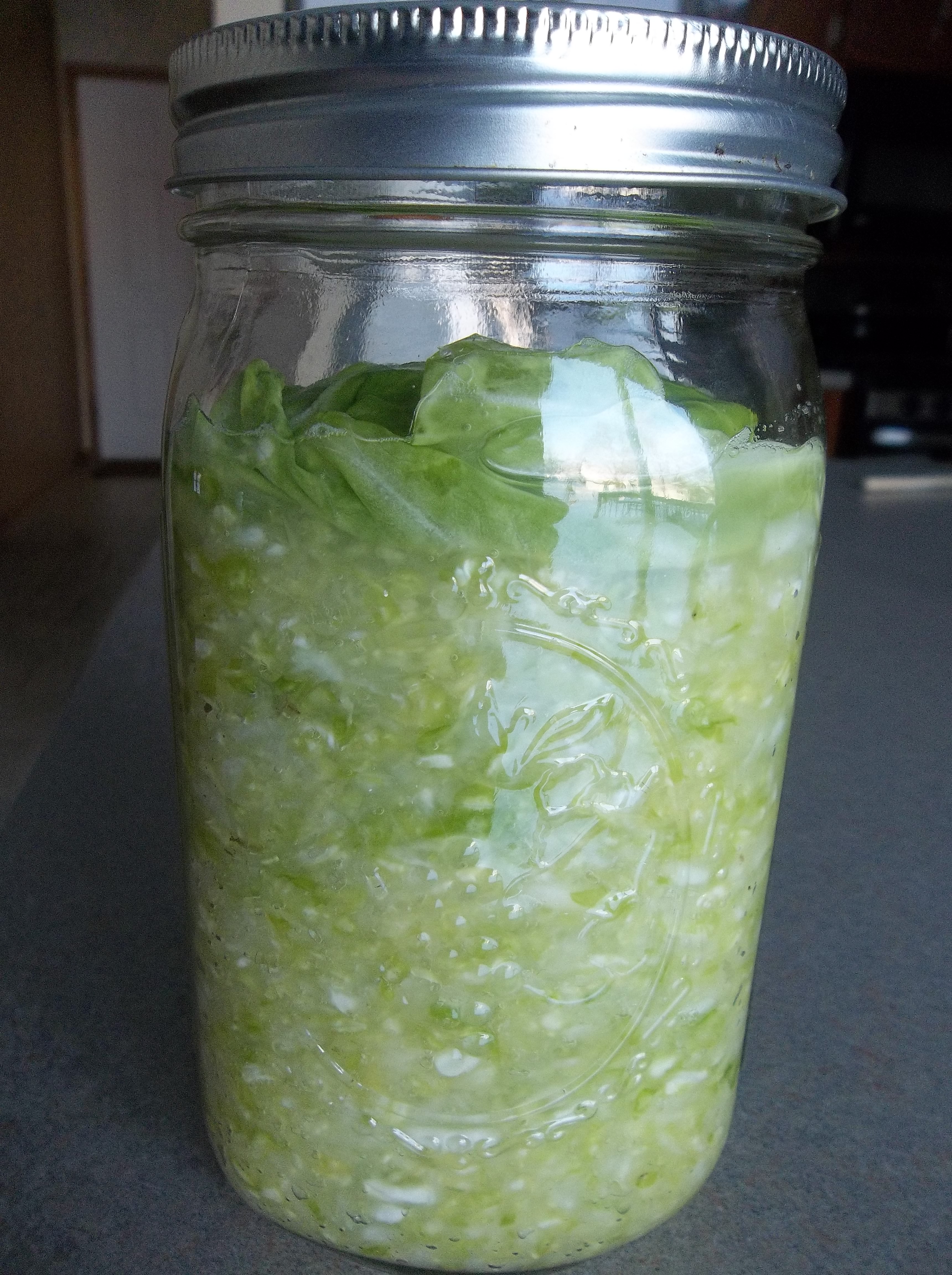 When the cabbage is packed into the jar (leaving at least an inch of “head room” at the top of the jar), I place the saved cabbage leaf on top of the shredded kraut and press it down firmly until it is submerged under the liquid and no solid cabbage is left floating above the liquid line. This is an important step, as any cabbage left above the liquid has the tendency to mold. Also, leaving at least an inch of room in the jar is also important, as the kraut will start to expand as it ferments.