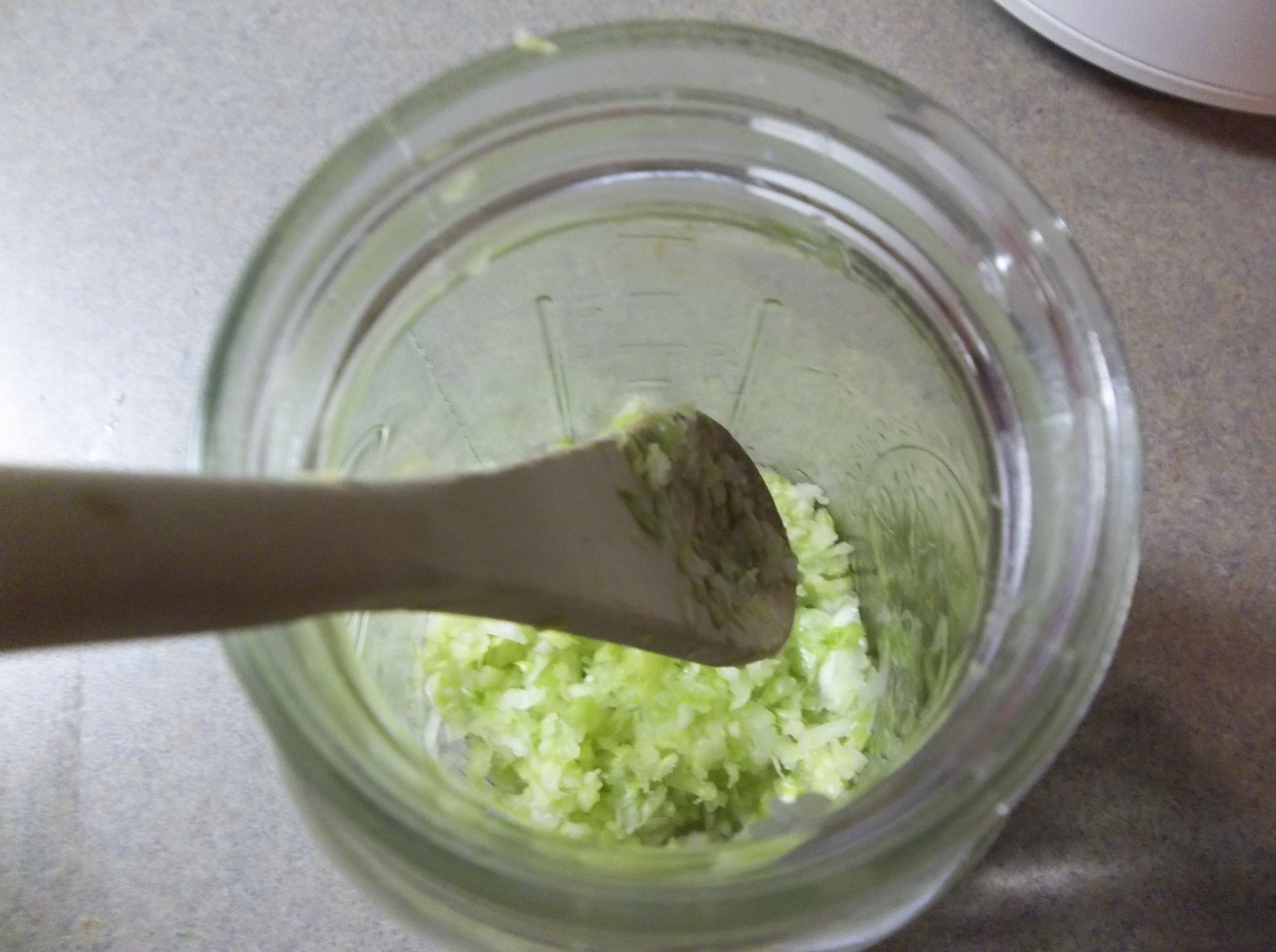 Now you can spoon the cabbage (or use your hands) into your glass Mason jar. PACK IT TIGHTLY as this is an anaerobic process (meaning “no oxygen”) and you don’t want big air bubbles remaining in your jar. Some people will use a wooden mallet or tool specifically made for this purpose to pack their cabbage in tightly. Being the fancy fermenter that I am, I just use a wooden spoon 😉