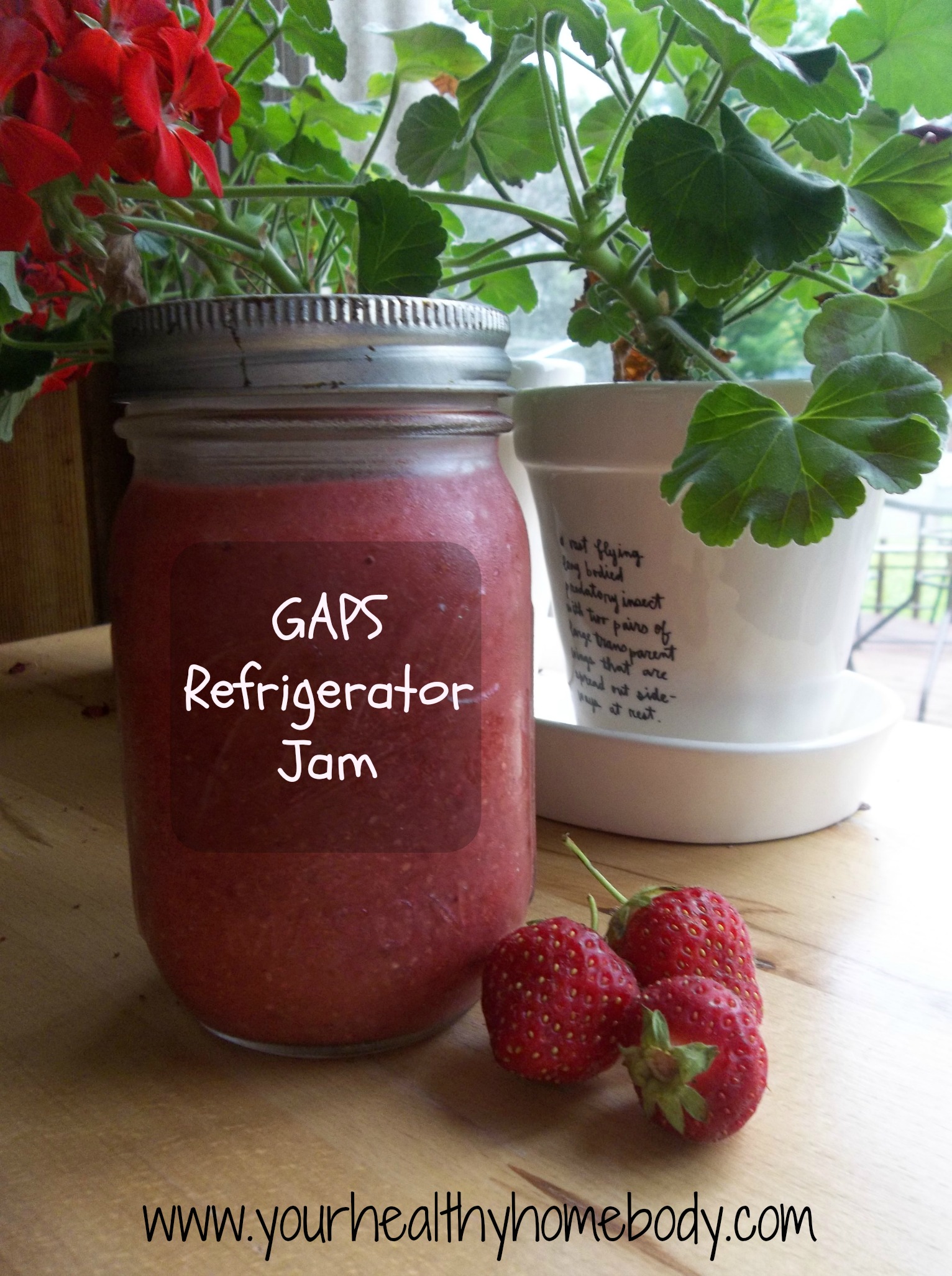 Yesterday when I purchased our strawberries, I got a few extra pints than usual because I wanted to try to make some strawberry jam. Prior to starting the GAPS Diet, I would regularly make freezer jam to keep throughout the winter as a special treat on our bread in the mornings. Once we started with GAPS, I no longer made jam as the recipe I formerly used included both sugar and pectin, ingredients that are not legal on the GAPS Diet. However, with this recipe, you can have your GAPS and strawberry jam too! My boys would have declared it “delicious” but they were too busy eating it lathered on their cinnamon raisin bread … I just got a couple “mm-hmm”s when I asked if they thought it was good.